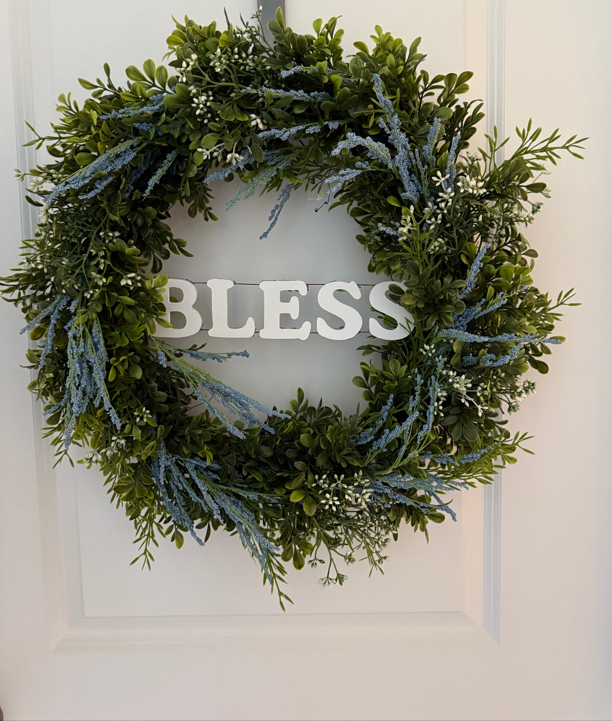 Adorn with a Bless sign, see your front door with this unique boxwood wreath.